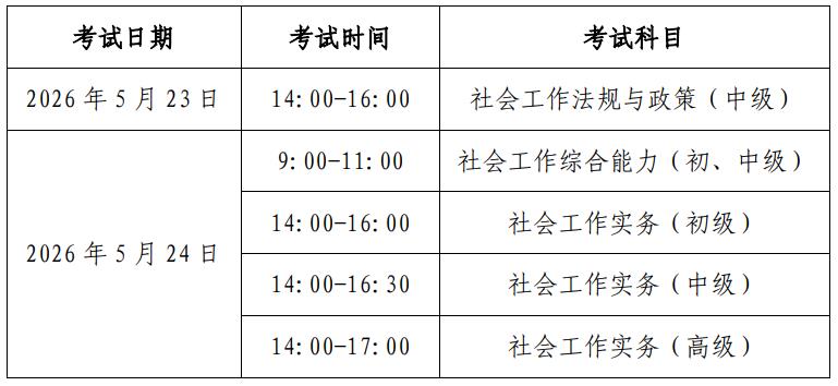 报名时间北京2026年社会工作师考试报名时间为3月16日至3月25日,网上审核时间为3月16日-3月25日,网上缴费时间为3月27 日至3月30 日,准考证打印时间为5月19 日至5月24日。