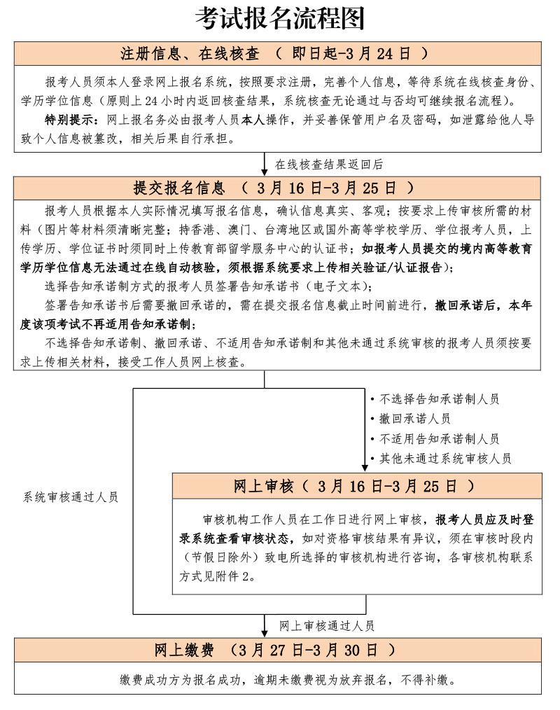 2.提交报名信息时间为2026年3月16日至3月25日。注册信息原则上24小时内返回核查结果,建议报考人员提前完成用户注册及照片、学历、学位等信息维护,以免错过报名。报考人员上传的照片将用于准考证、考场座次表及资格证书的制作,上传成功后无法自行修改,请慎重选用。